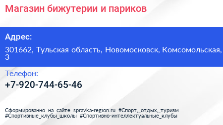 Магазин бижутерии и париков по адресу 301662, Тульская область, Новомосковск, Комсомольская, 3 в дальнейшем Организация, размещена в следующих категориях: