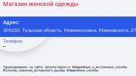 Магазин женской одежды по адресу 301650, Тульская область, Новомосковск, Маяковского, 27 в дальнейшем Организация, размещена в следующих категориях: