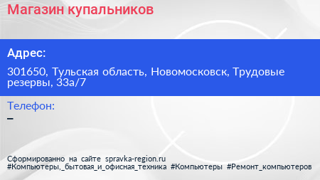 Магазин купальников по адресу 301650, Тульская область, Новомосковск, Трудовые резервы, 33а/7 в дальнейшем Организация, размещена в следующих категориях: