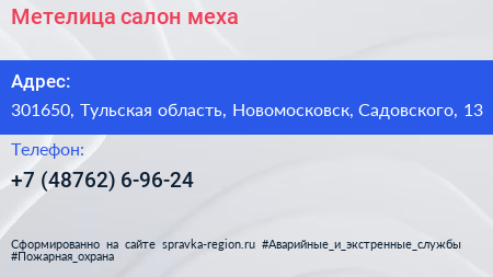 Метелица, салон меха по адресу 301650, Тульская область, Новомосковск, Садовского, 13 в дальнейшем Организация, размещена в следующих категориях: