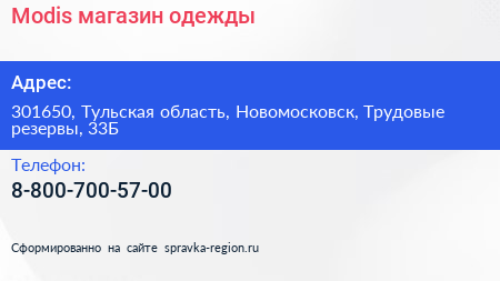 Modis, магазин одежды по адресу 301650, Тульская область, Новомосковск, Трудовые резервы, 33Б в дальнейшем Организация, размещена в следующих категориях: