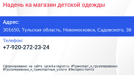 Надень-ка, магазин детской одежды по адресу 301650, Тульская область, Новомосковск, Садовского, 38 в дальнейшем Организация, размещена в следующих категориях: