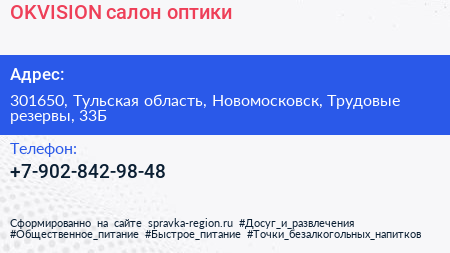 OKVISION, салон оптики по адресу 301650, Тульская область, Новомосковск, Трудовые резервы, 33Б в дальнейшем Организация, размещена в следующих категориях: