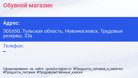 Обувной магазин по адресу 301650, Тульская область, Новомосковск, Трудовые резервы, 33а в дальнейшем Организация, размещена в следующих категориях: