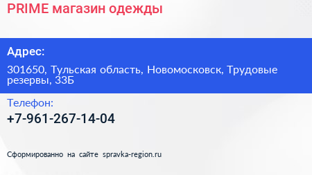 PRIME, магазин одежды по адресу 301650, Тульская область, Новомосковск, Трудовые резервы, 33Б в дальнейшем Организация, размещена в следующих категориях: