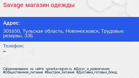 Savage, магазин одежды по адресу 301650, Тульская область, Новомосковск, Трудовые резервы, 33Б в дальнейшем Организация, размещена в следующих категориях: