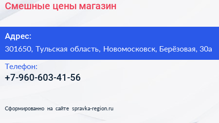 Смешные цены, магазин по адресу 301650, Тульская область, Новомосковск, Берёзовая, 30а в дальнейшем Организация, размещена в следующих категориях: