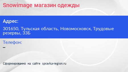 Snowimage, магазин одежды по адресу 301650, Тульская область, Новомосковск, Трудовые резервы, 33Б в дальнейшем Организация, размещена в следующих категориях: