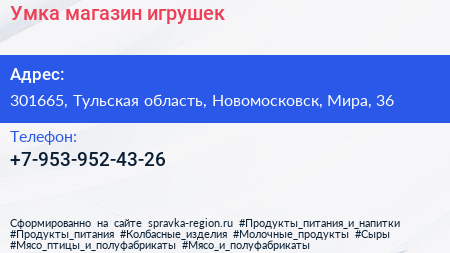 Умка, магазин игрушек по адресу 301665, Тульская область, Новомосковск, Мира, 36 в дальнейшем Организация, размещена в следующих категориях: