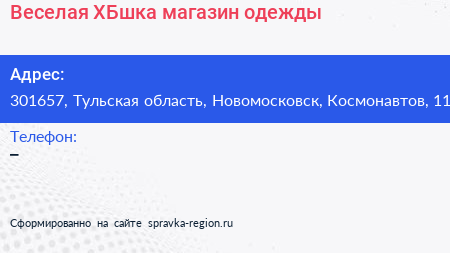 Веселая ХБшка, магазин одежды по адресу 301657, Тульская область, Новомосковск, Космонавтов, 11 в дальнейшем Организация, размещена в следующих категориях: