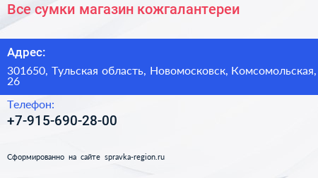 Все сумки, магазин кожгалантереи по адресу 301650, Тульская область, Новомосковск, Комсомольская, 26 в дальнейшем Организация, размещена в следующих категориях: