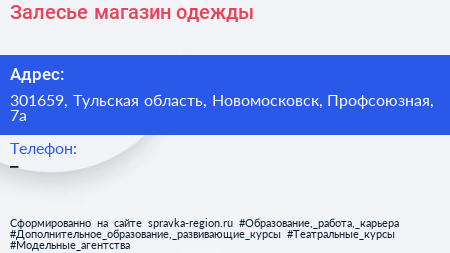 Залесье, магазин одежды по адресу 301659, Тульская область, Новомосковск, Профсоюзная, 7а в дальнейшем Организация, размещена в следующих категориях: