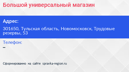 Большой универсальный магазин по адресу 301650, Тульская область, Новомосковск, Трудовые резервы, 53 в дальнейшем Организация, размещена в следующих категориях: