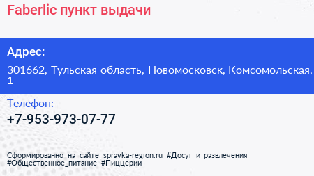 Faberlic, пункт выдачи по адресу 301662, Тульская область, Новомосковск, Комсомольская, 1 в дальнейшем Организация, размещена в следующих категориях: