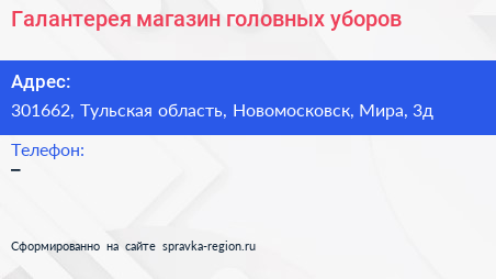 Галантерея, магазин головных уборов по адресу 301662, Тульская область, Новомосковск, Мира, 3д в дальнейшем Организация, размещена в следующих категориях: