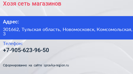 Хозя, сеть магазинов по адресу 301662, Тульская область, Новомосковск, Комсомольская, 3 в дальнейшем Организация, размещена в следующих категориях: