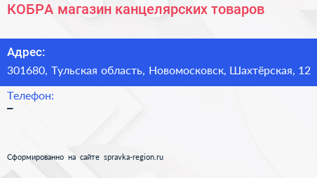 КОБРА, магазин канцелярских товаров по адресу 301680, Тульская область, Новомосковск, Шахтёрская, 12 в дальнейшем Организация, размещена в следующих категориях: