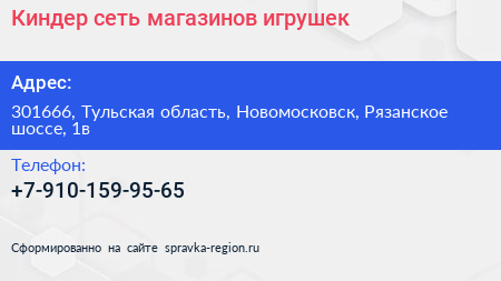 Киндер, сеть магазинов игрушек по адресу 301666, Тульская область, Новомосковск, Рязанское шоссе, 1в в дальнейшем Организация, размещена в следующих категориях: