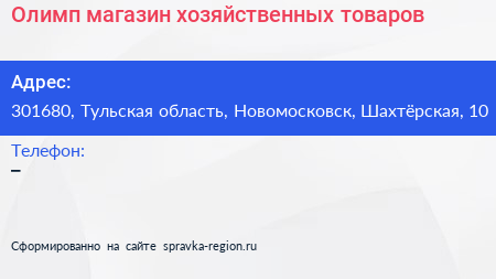 Олимп, магазин хозяйственных товаров по адресу 301680, Тульская область, Новомосковск, Шахтёрская, 10 в дальнейшем Организация, размещена в следующих категориях: