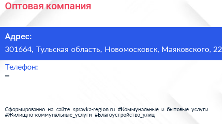 Оптовая компания по адресу 301664, Тульская область, Новомосковск, Маяковского, 22 в дальнейшем Организация, размещена в следующих категориях: