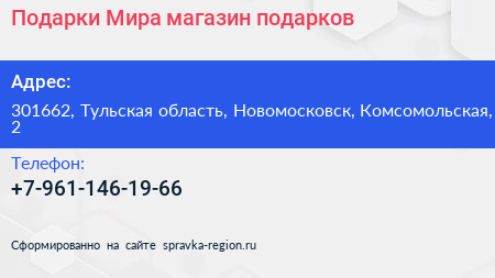 Подарки Мира, магазин подарков по адресу 301662, Тульская область, Новомосковск, Комсомольская, 2 в дальнейшем Организация, размещена в следующих категориях: