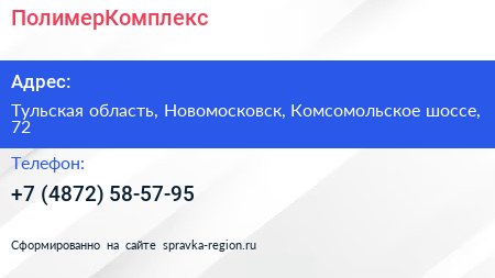 ПолимерКомплекс по адресу Тульская область, Новомосковск, Комсомольское шоссе, 72 в дальнейшем Организация, размещена в следующих категориях:
