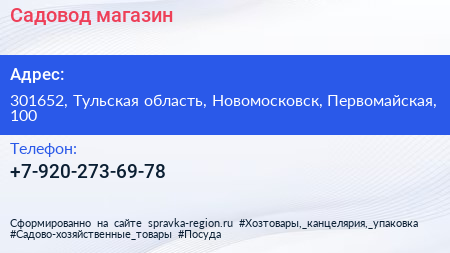 Садовод, магазин по адресу 301652, Тульская область, Новомосковск, Первомайская, 100 в дальнейшем Организация, размещена в следующих категориях: