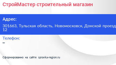 СтройМастер, строительный магазин по адресу 301663, Тульская область, Новомосковск, Донской проезд, 12 в дальнейшем Организация, размещена в следующих категориях: