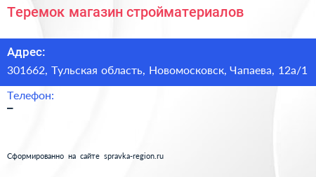 Теремок, магазин стройматериалов по адресу 301662, Тульская область, Новомосковск, Чапаева, 12а/1 в дальнейшем Организация, размещена в следующих категориях: