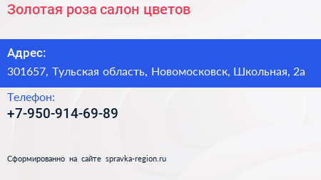 Золотая роза, салон цветов по адресу 301657, Тульская область, Новомосковск, Школьная, 2а в дальнейшем Организация, размещена в следующих категориях: