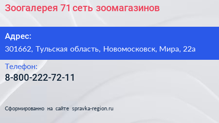 Зоогалерея 71, сеть зоомагазинов по адресу 301662, Тульская область, Новомосковск, Мира, 22а в дальнейшем Организация, размещена в следующих категориях: