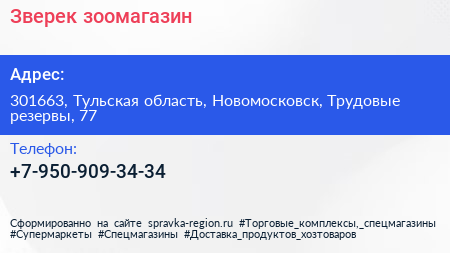 Зверек, зоомагазин по адресу 301663, Тульская область, Новомосковск, Трудовые резервы, 77 в дальнейшем Организация, размещена в следующих категориях: