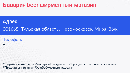 Бавария beer, фирменный магазин по адресу 301665, Тульская область, Новомосковск, Мира, 36ж в дальнейшем Организация, размещена в следующих категориях: