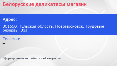 Белорусские деликатесы, магазин по адресу 301650, Тульская область, Новомосковск, Трудовые резервы, 33а в дальнейшем Организация, размещена в следующих категориях: