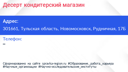 Десерт, кондитерский магазин по адресу 301661, Тульская область, Новомосковск, Рудничная, 17Б в дальнейшем Организация, размещена в следующих категориях: