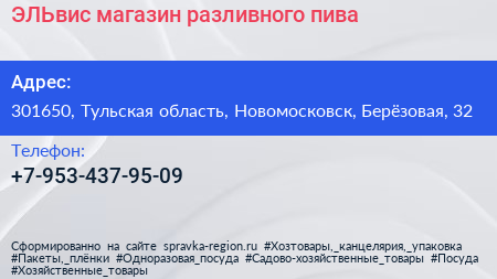 ЭЛЬвис, магазин разливного пива по адресу 301650, Тульская область, Новомосковск, Берёзовая, 32 в дальнейшем Организация, размещена в следующих категориях: