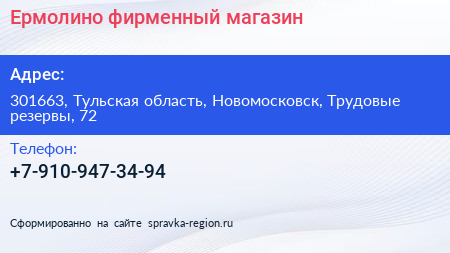 Ермолино, фирменный магазин по адресу 301663, Тульская область, Новомосковск, Трудовые резервы, 72 в дальнейшем Организация, размещена в следующих категориях:
