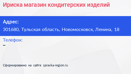 Ириска, магазин кондитерских изделий по адресу 301680, Тульская область, Новомосковск, Ленина, 18 в дальнейшем Организация, размещена в следующих категориях: