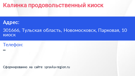 Калинка, продовольственный киоск по адресу 301666, Тульская область, Новомосковск, Парковая, 10 киоск в дальнейшем Организация, размещена в следующих категориях: