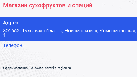 Магазин сухофруктов и специй по адресу 301662, Тульская область, Новомосковск, Комсомольская, 1 в дальнейшем Организация, размещена в следующих категориях: