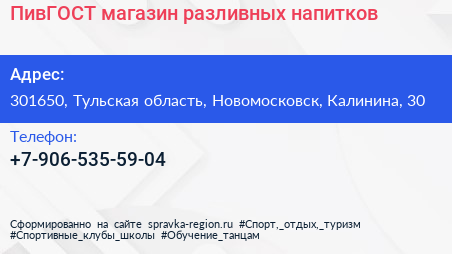 ПивГОСТ, магазин разливных напитков по адресу 301650, Тульская область, Новомосковск, Калинина, 30 в дальнейшем Организация, размещена в следующих категориях: