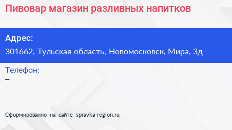 Пивовар, магазин разливных напитков по адресу 301662, Тульская область, Новомосковск, Мира, 3д в дальнейшем Организация, размещена в следующих категориях: