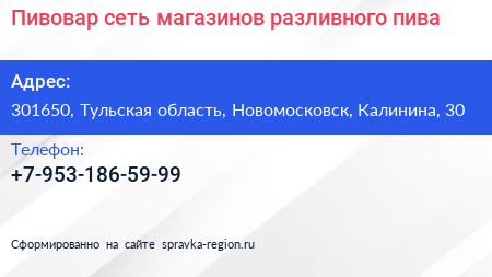 Пивовар, сеть магазинов разливного пива по адресу 301650, Тульская область, Новомосковск, Калинина, 30 в дальнейшем Организация, размещена в следующих категориях: