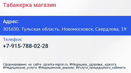 Табакерка, магазин по адресу 301650, Тульская область, Новомосковск, Свердлова, 19 в дальнейшем Организация, размещена в следующих категориях:
