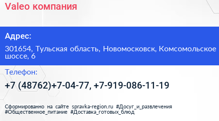 Valeo, компания по адресу 301654, Тульская область, Новомосковск, Комсомольское шоссе, 6 в дальнейшем Организация, размещена в следующих категориях: