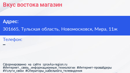 Вкус востока, магазин по адресу 301665, Тульская область, Новомосковск, Мира, 11ж в дальнейшем Организация, размещена в следующих категориях: