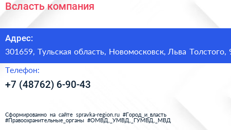 Для связи с организацией воспользуйтесь номером телефона: +7 (48762) 6-90-43. Пн: c 08:00-17:00, Вт: c 08:00-17:00, Ср: c 08:00-17:00, Чт: c 08:00-17:00, Пт: c 08:00-17:00, Сб: выходной, Вс: выходной, вы можете обратиться в эту организацию.