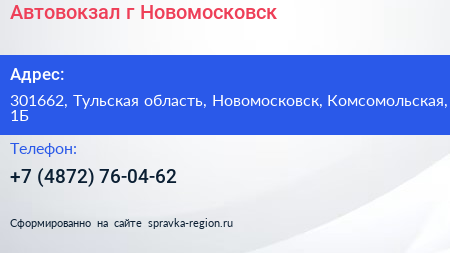 Автовокзал, г. Новомосковск по адресу 301662, Тульская область, Новомосковск, Комсомольская, 1Б в дальнейшем Организация, размещена в следующих категориях: