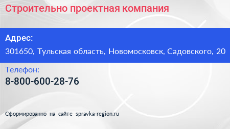 Строительно-проектная компания по адресу 301650, Тульская область, Новомосковск, Садовского, 20 в дальнейшем Организация, размещена в следующих категориях: