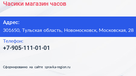 Часики, магазин часов по адресу 301650, Тульская область, Новомосковск, Московская, 28 в дальнейшем Организация, размещена в следующих категориях: